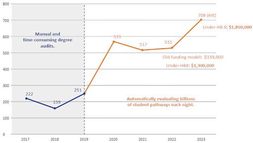 By automating and streamlining processes related to degree audits, progression tracking, and credentialing, NCTC significantly enhanced their ability to identify and award credentials, leading to substantial increases in performance-based funding.