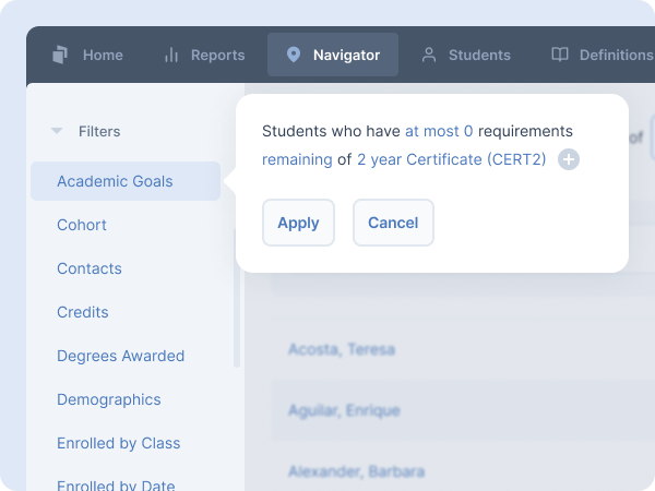 Compliance and accreditation reporting shouldn’t drain time and resources. ZogoTech brings all your institutional data into one place – so institutions can quickly access the numbers, definitions, and trends they need to complete submissions faster, more confidently, and with fewer bottlenecks. The result? Less time chasing data, more time improving student and institutional success.