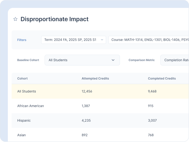 Automatically calculate key outcomes like retention, persistence, and completion – no manual tracking needed.