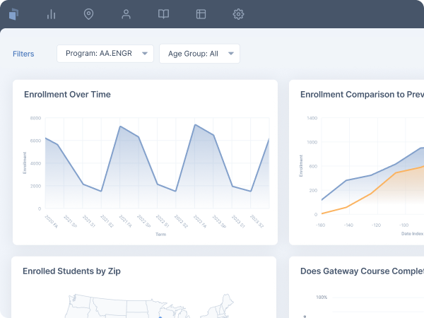 Support program pathway analysis to highlight where students persist, stop out, or succeed.